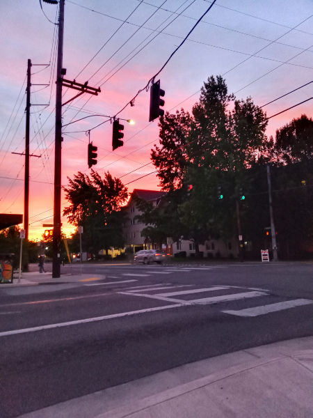 I left the bar, because all the noise was beginning to get to me. Moving slowly to the bus stop, I noticed the colors in the sky. I have not been paying enough attention to sunsets, and was glad to have taken this photo before the bus arrived. And dusk.
